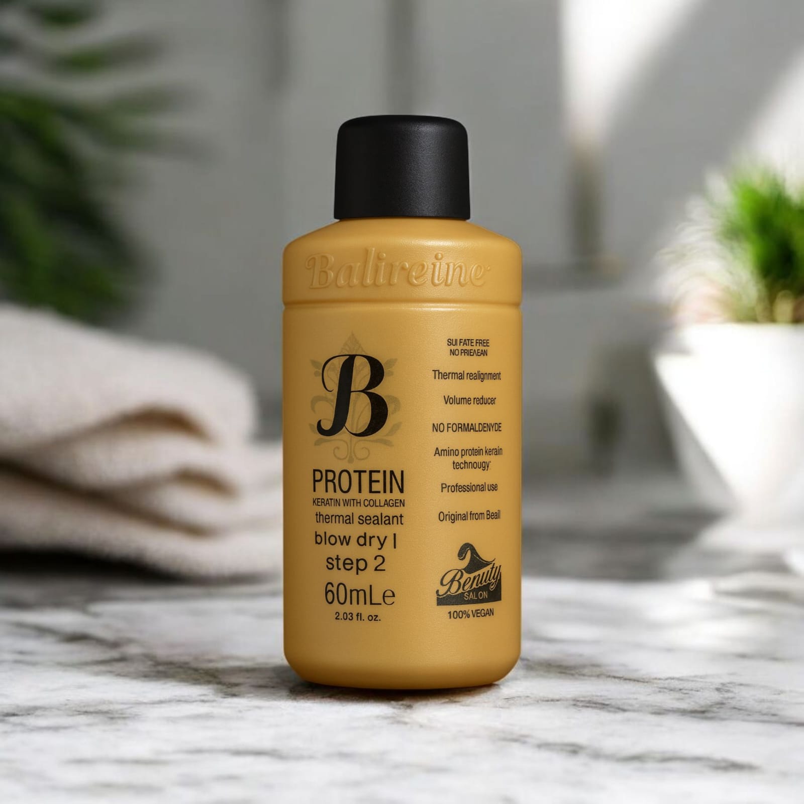يُجفف بالمجفف الحراري، ثم يُمرر المكواة الحرارية خصلة بخصلة لتثبيت البروتين.
